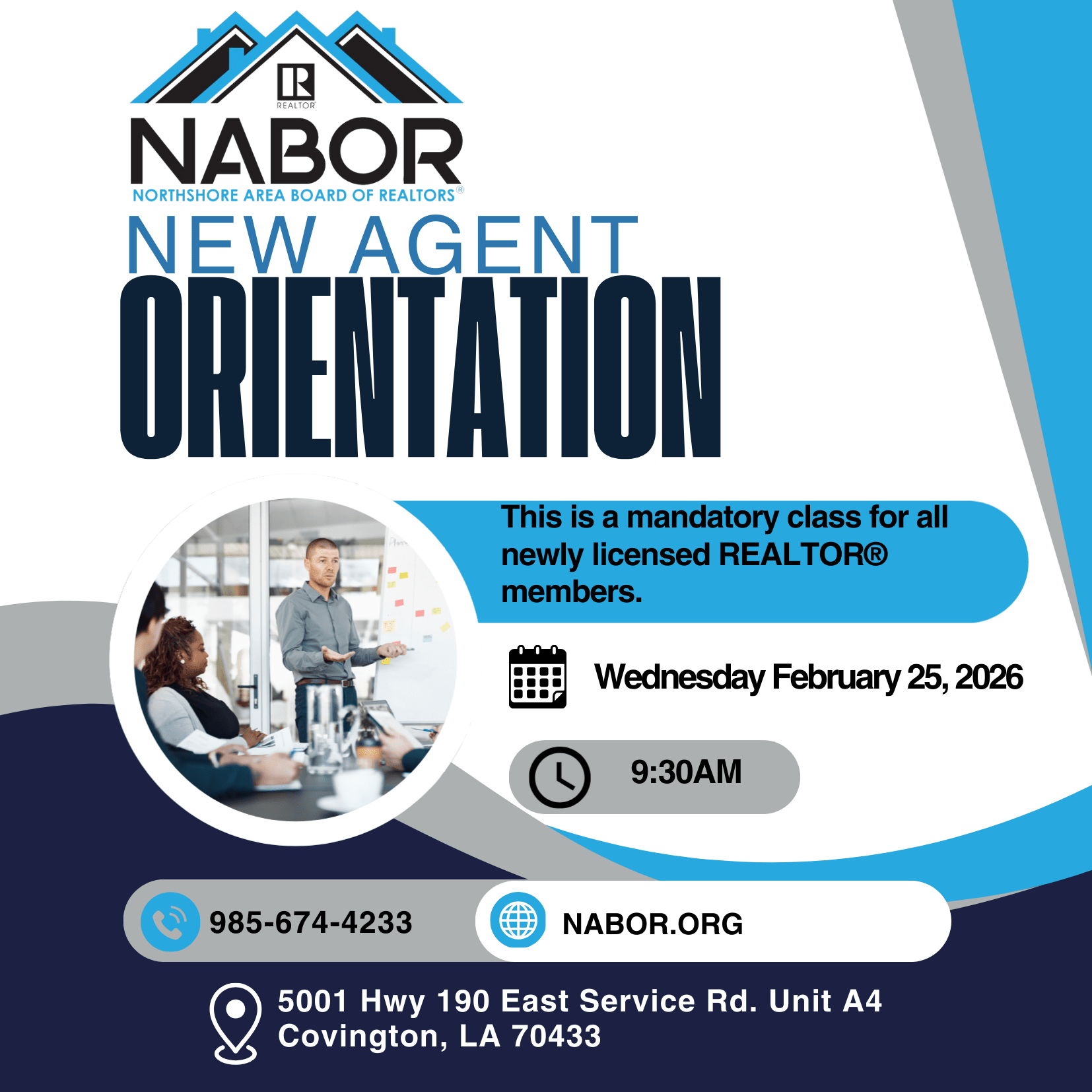 Welcome to the Northshore Area Board of REALTORS® (NABOR)! As a new member, you are required to complete New Member Orientation, designed to help you get the most value from your membership and set you up for success in your real estate career. During this interactive session, you’ll learn about: The benefits and resources available through NABOR, Louisiana REALTORS®, and the National Association of REALTORS® (NAR) REALTOR® ethics, professionalism, and industry expectations Association tools, technology, and support services available to help you grow your business Opportunities to get involved, network, and build your local real estate community This session also provides a great opportunity to meet fellow new members, connect with NABOR leadership, and ask questions about REALTOR® membership, local advocacy, and education. Event Details: 📅 Orientation Date: Wednesday, February 25, 2026 🕘 Time: 9:30 AM – 1:00 PM Location: NABOR Office – Covington, LA Cost: Free to attend (registration required) Capacity: Limited to 15 participants per session (first come, first served) Cancellation Policy: If you register but cannot attend, please cancel at least 48 hours prior to the event to avoid a $25 no-show fee. ☕ Light breakfast, pastries, and lunch will be provided. Reserve Your Seat Today!