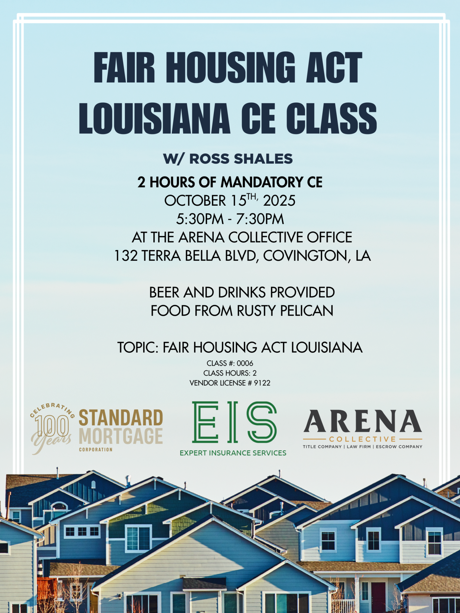MANDATORY 2 Hours FAIR HOUSING CE Class sponsored by Arena Collective, Expert Insurance Services and Standard Mortgage! Join them at the Arena Collective Office at 132 Terra Bella Blvd in Covington, LA . Beer and Drinks provided! Food sponsored by Rusty Pelican. Register by calling Arena Collective at (985) 338-3980.