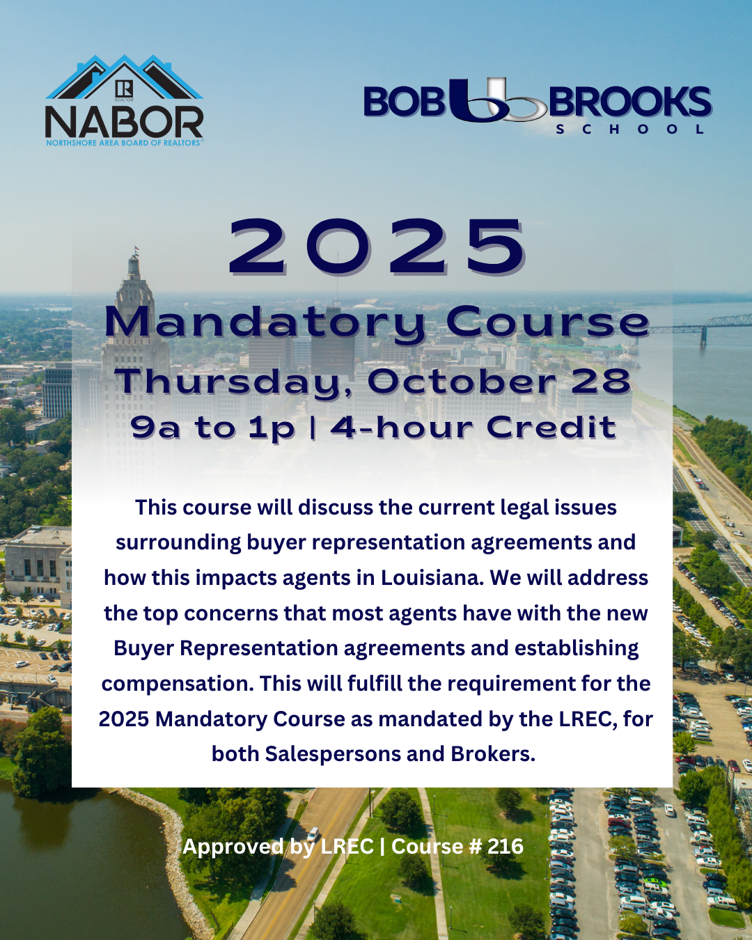 This course will discuss the current legal issues surrounding buyer representation agreements and how this impacts agents in Louisiana. We will address the top concerns that most agents have with the new Buyer Representation agreements and establishing compensation. Finally, we will look at the changing landscape of compensation and how it will affect the CMA and appraisal process. This will fulfill the requirement for the 2025 Mandatory Course as mandated by the LREC, for both Salespersons and Brokers. *There is NO additional Broker Mandatory for 2025.* YOU WILL RECEIVE AN EMAIL FROM BOB BROOKS THE DAY BEFORE CLASS WITH THE LINK TO GET INTO THE CLASS.
