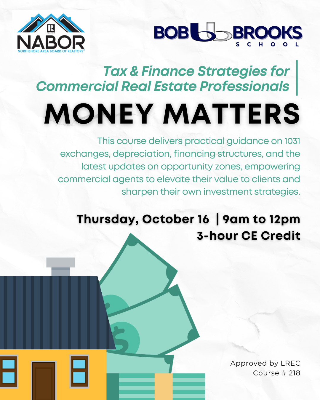 In the high-stakes world of commercial real estate, financial acumen can make or break a deal. Money Moves equips practitioners with actionable tax strategies, insights into cost segregation, and an overview of financing tools that can maximize returns and unlock investment potential. This course delivers practical guidance on 1031 exchanges, depreciation, financing structures, and the latest updates on opportunity zones, empowering commercial agents to elevate their value to clients and sharpen their own investment strategies. You will receive an email from Bob Brooks school with the link to the course one day before the start of class.