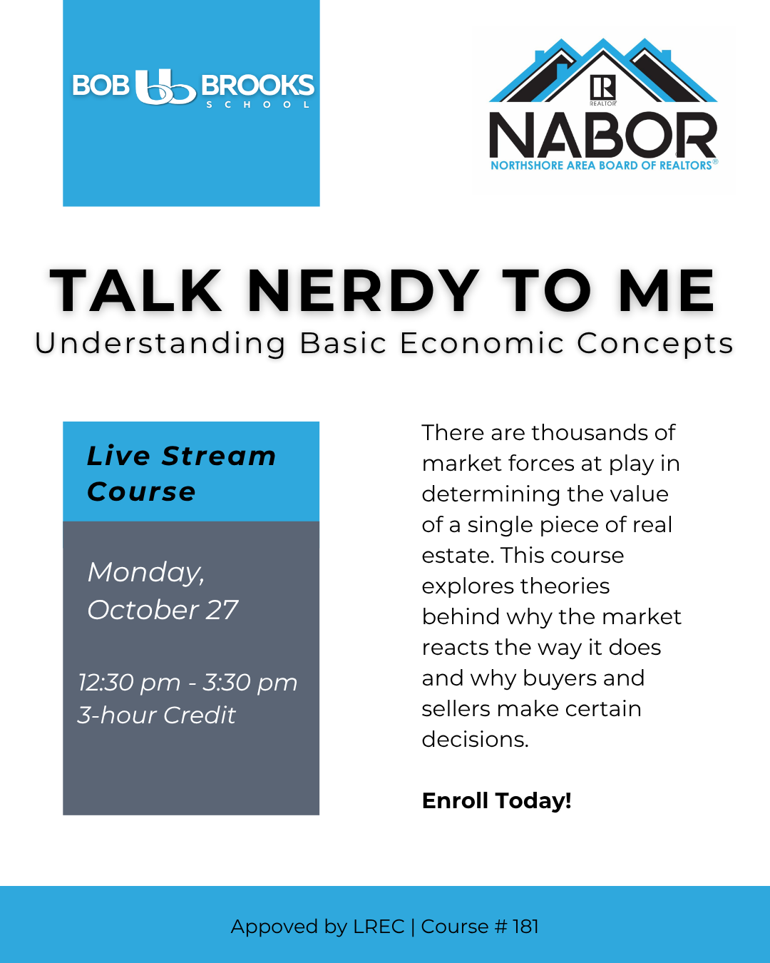 There are thousands of market forces at play in determining the value of a single piece of real estate. This course explores theories behind why the market reacts the way it doesn’t and why buyers and sellers make certain decisions. The agent will gain knowledge of how the rise and fall of interest rates can cause a drastic effect on home prices as well as home demand. This course will explore the tragedy of the commons in determining whether a decision is in the best interest of a single person or for the entire community. Finally, we will suggest strategies to help clients reach an agreement with their counterpart in a negotiation. You will be sent an email from Bob Brooks school with the instructions for the class-24 hours before the start of class. The Course Instructor is Brent Lancaster.